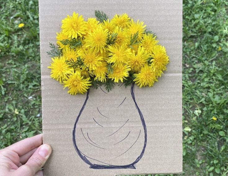 Rajzoljunk a kartonra egy vázát. A váza fölé golyóstollal szurkáljunk lyukakat. A frissen szedett apró virágokat szúrjuk bele a lyukakba.